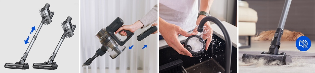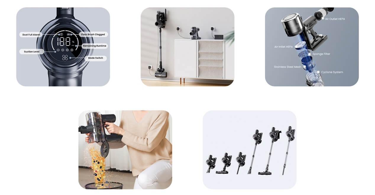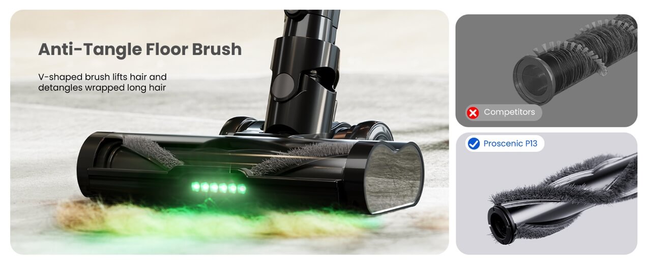新品上市|Proscenic P13 家用無線吸塵器2024-04-20 導讀:Proscenic P13無線吸塵器,全屋深度清潔,非常適合有毛茸茸的寵物的家庭。 ?Proscenic P13無線吸塵器,全屋深度清潔,非常適合有毛茸茸的寵物的家庭。 強大的吸力,可清潔所有樓層?它具有高達35kPa(120AW)的強大吸力,是快速清潔的理想選擇,適用性廣泛。帶有硬刷毛和軟刷毛的二合一刷輥可輕松清潔地毯、地毯和硬地板上的污垢和碎屑。 高性能新電池?P13 吸塵器配備了最新的 2,500mAh 電池,一次充電可提供長達 45 分鐘的運行時間! 防纏繞地刷?特別設計的V形刷在清潔過程中可提起毛發并理順纏結的長毛和寵物毛發?,F在用吸塵器吸頭發變得輕而易舉! 綠色LED大燈改進后的綠色探測頭燈可有效捕捉肉眼看不見的細小顆粒,有助于更清晰地探測灰塵。 帶LED顯示屏的數字屏和三種吸力模式:顯示當前性能,包括選定的性能模式、剩余運行時間和維護警報,以完全控制您的清潔。三種充電選項:將吸塵器安裝在墻壁上以便整齊存放和充電、將電池內置在主機中充電或取出電池單獨充電。五級過濾系統:五級密封過濾系統可捕獲 99.99% 小至 0.1 μm 的細顆粒,并釋放無過敏原的凈化空氣。一鍵清空集塵盒:借助 1.2 升集塵盒,可以不間斷地進行更多清潔。只需輕輕一按即可輕松清空。六合一多功能真空吸塵器:它配有三把刷子,包括地板刷、縫隙工具和二合一除塵刷。與可調節伸縮管一起,它可以組裝成 6 種組合,以實現從地板到天花板的多功能清潔。 靈活的地板刷靈活的 180° 旋轉和 90° 上下移動,讓您可以全方位清潔。 可拆卸電池設計:電池可以從吸塵器中取出并獨立充電。如有必要,您可以購買額外的電池以使電池壽命加倍。伸縮管設計:伸縮管的長度可調節,更方便操作,使用更舒適。可清洗組件:?只需清洗集塵盒、HEPA 過濾器和內部組件即可保持最佳性能。降噪:?噪音優化技術可實現 78 dB 的安靜運行。清潔時不打擾您的家人和寵物。